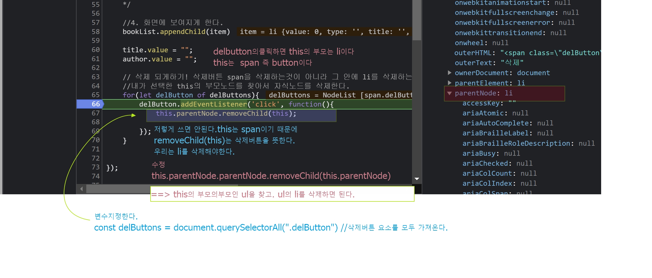 //this.parentNode.remove(this); li를 사라지면되는데 remove(this)에서 this는 삭제버튼이다.
