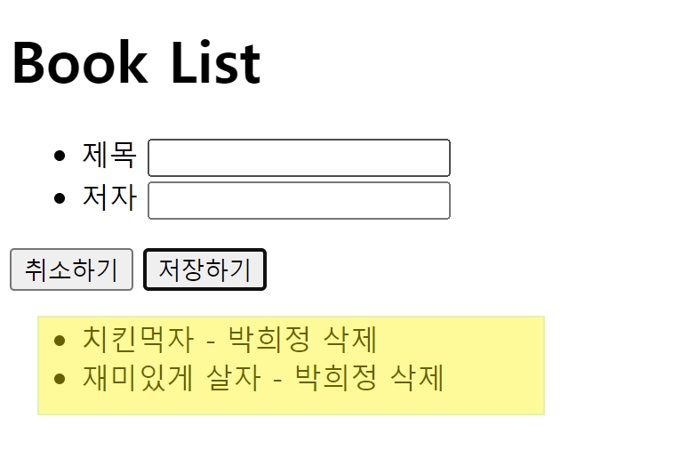 [저장하기]버튼을 클릭하면 '제목'과 '저자'필드에 입력된 내용을 가져와서 bookList영역에 <li> 태그와 함께 추가하자.