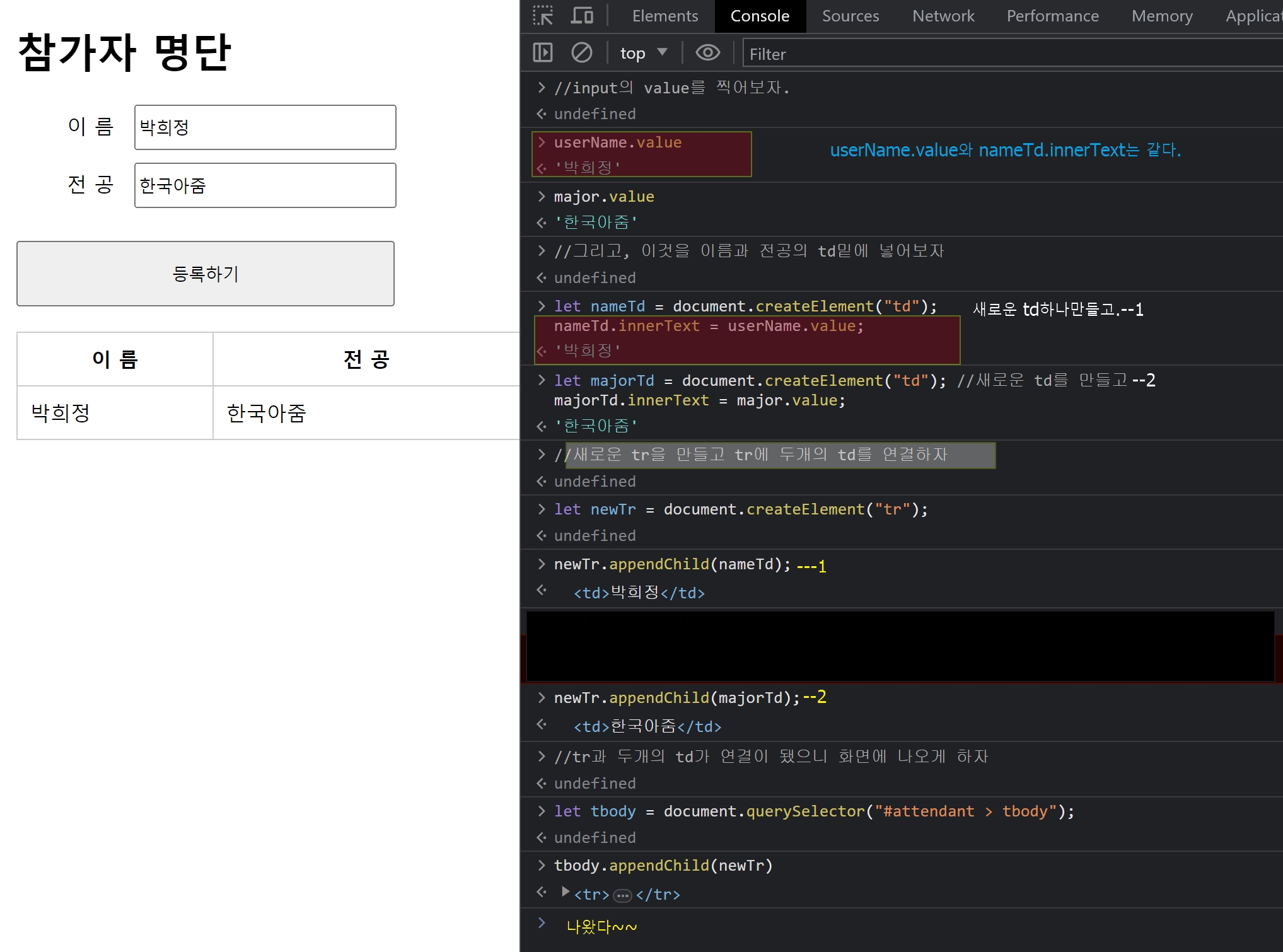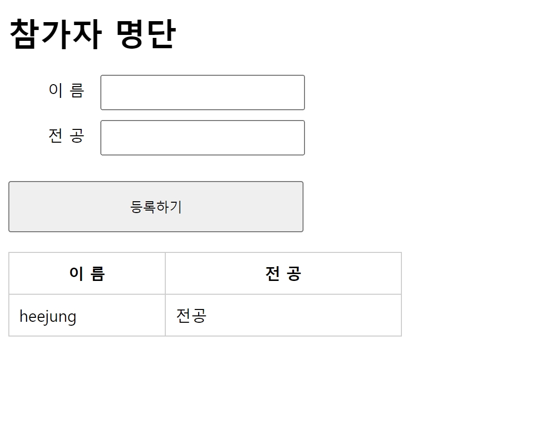 등록하기 버튼을 클릭하면 이름과 전공 밑의 td밑에 추가되어 화면에 출력된다.